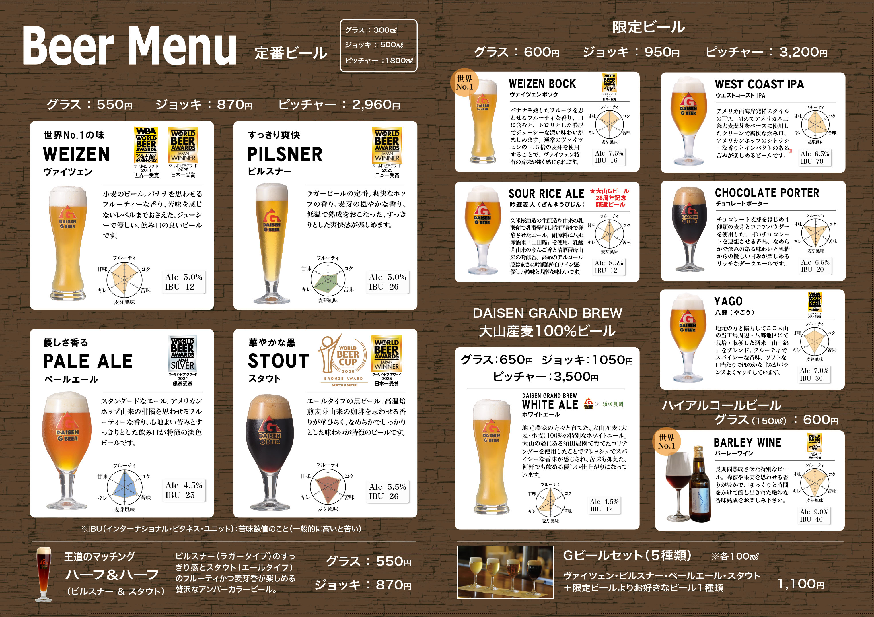 ピルスナー、ペールエール、ヴァイツェン、スタウト 各300ml…550円