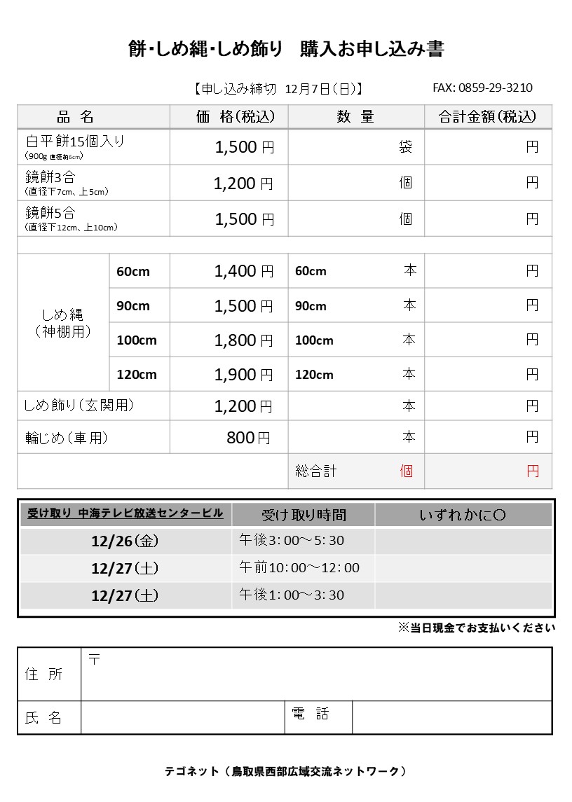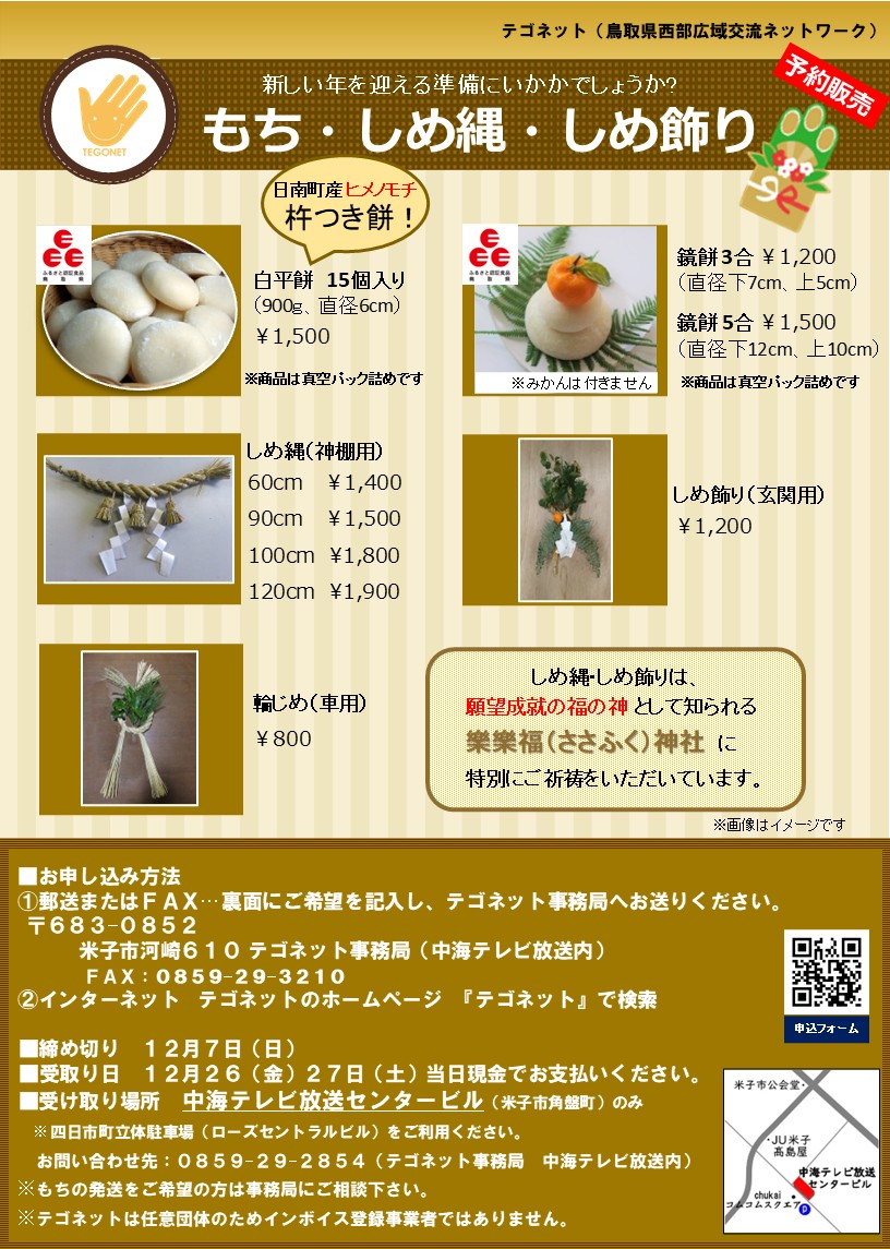 郵送:〒683-0852 米子市河崎610 テゴネット事務局(中海テレビ放送内)「お餅・しめ縄・しめ飾り販売」