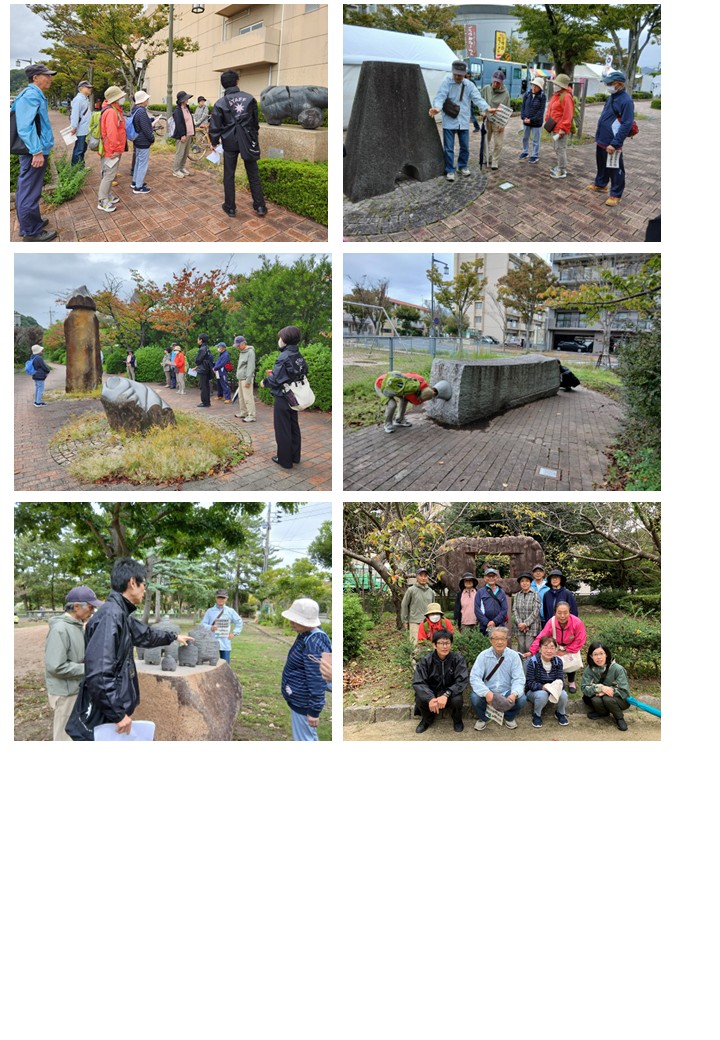 石の穴を懐中電灯で照らして中を覗いたり、石の肌触りを確かめるなど、西部総合事務所〜新加茂川沿い〜湊山公園〜加茂川沿い〜西部総合事務所まで11名の皆様とじっくり見ながら散策しました。
